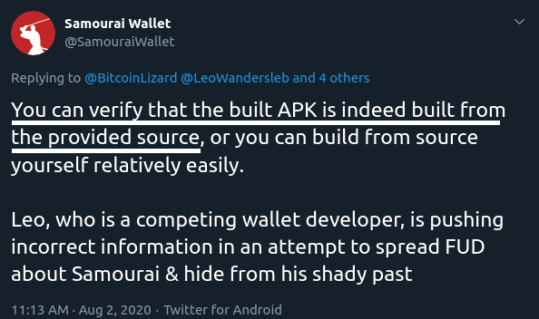 Update 2021-08-02: Samourai is currently certainly not reproducible as it’s even not possible to build it - due to an issue reported two months ago. We tried to build it again, as the Samourai devs don’t get tired to lie about the project’s reproducibility and we tried it again.